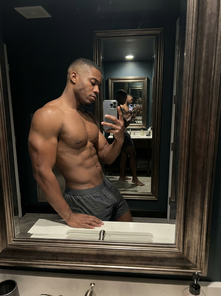 seductive model wearing boxer shorts, doing mirror selfie, holding iPhone, full body, their reflection captured in a sultry pose. the photo emphasizes their perfect body shapes.