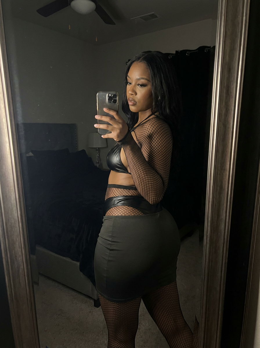 seductive model doing mirror selfie in black pu leather bikini and fishnet bodystockings, full body, her reflection captured in a sultry pose. the photo emphasizes their perfect body shapes. with a particular focus on her buttocks.