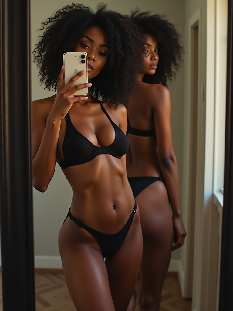 seductive model wearing lingerie , doing mirror selfie, holding iPhone, full body, their reflection captured in a sultry pose. the photo emphasizes their exaggerated, idealized body shapes.