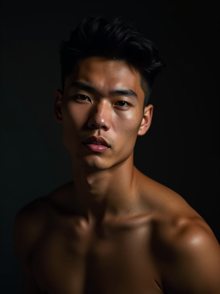 Sensual portrait of model with dramatic Rembrandt lighting. Intense gaze, confident expression. Studio lighting setup, artistic composition.