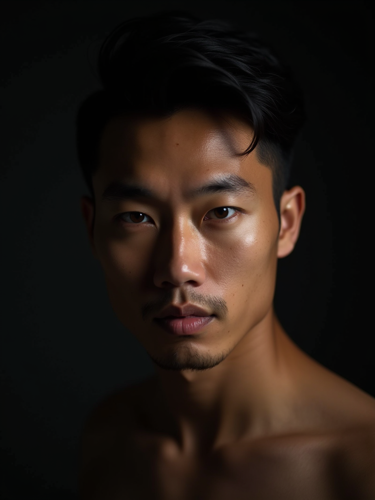 Sensual portrait of model with dramatic Rembrandt lighting. Intense gaze, confident expression. Studio lighting setup, artistic composition.