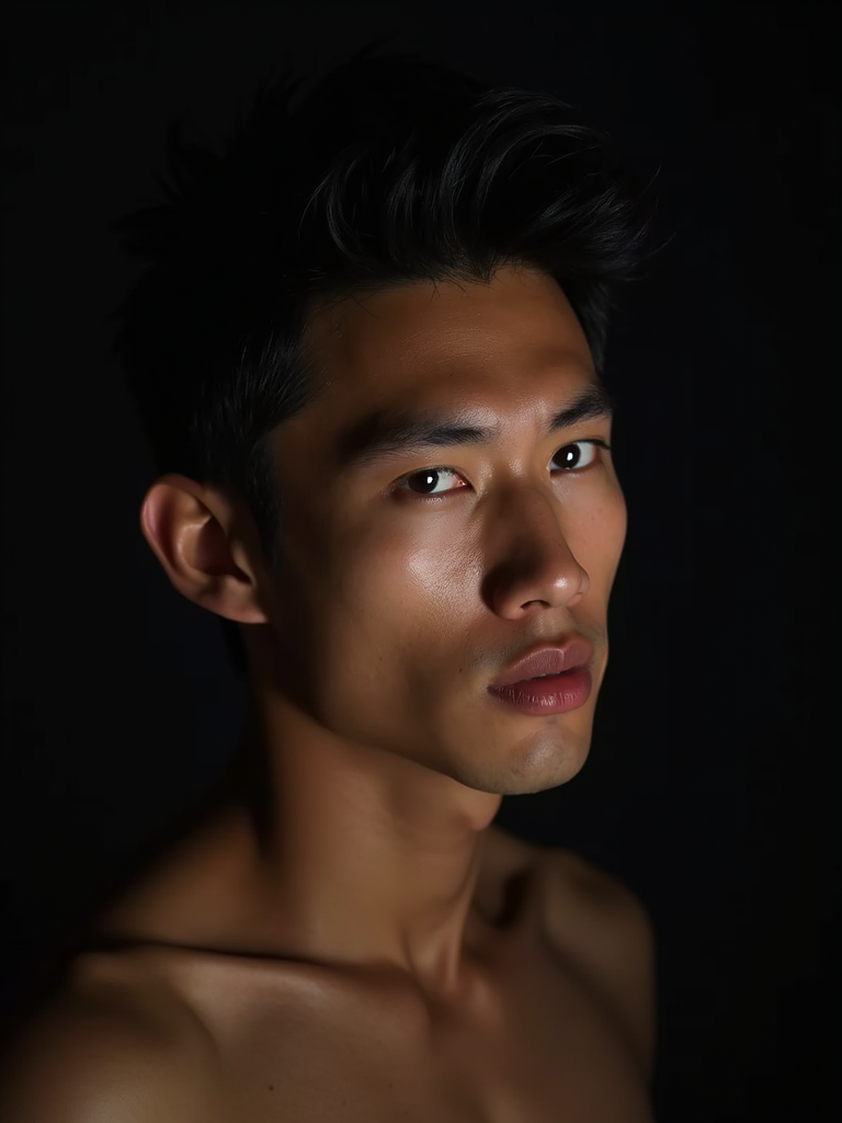 Sensual portrait of model with dramatic Rembrandt lighting. Intense gaze, confident expression. Studio lighting setup, artistic composition.