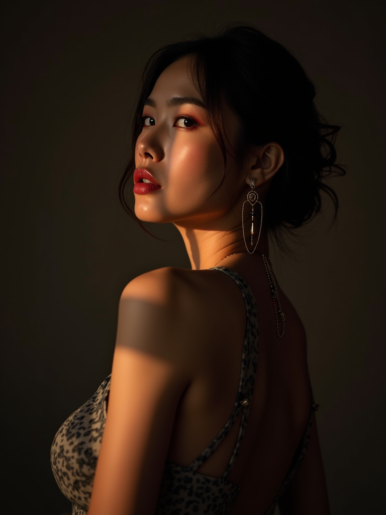 Sensual portrait of model with dramatic Rembrandt lighting. Alluring pose, sultry makeup . Studio lighting setup, artistic composition.