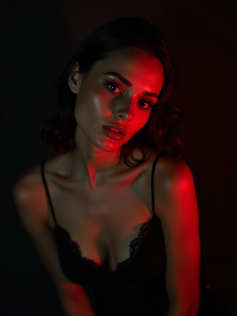 Sensual portrait of model with dramatic Rembrandt lighting. Alluring pose, sultry makeup . Studio lighting setup, artistic composition.