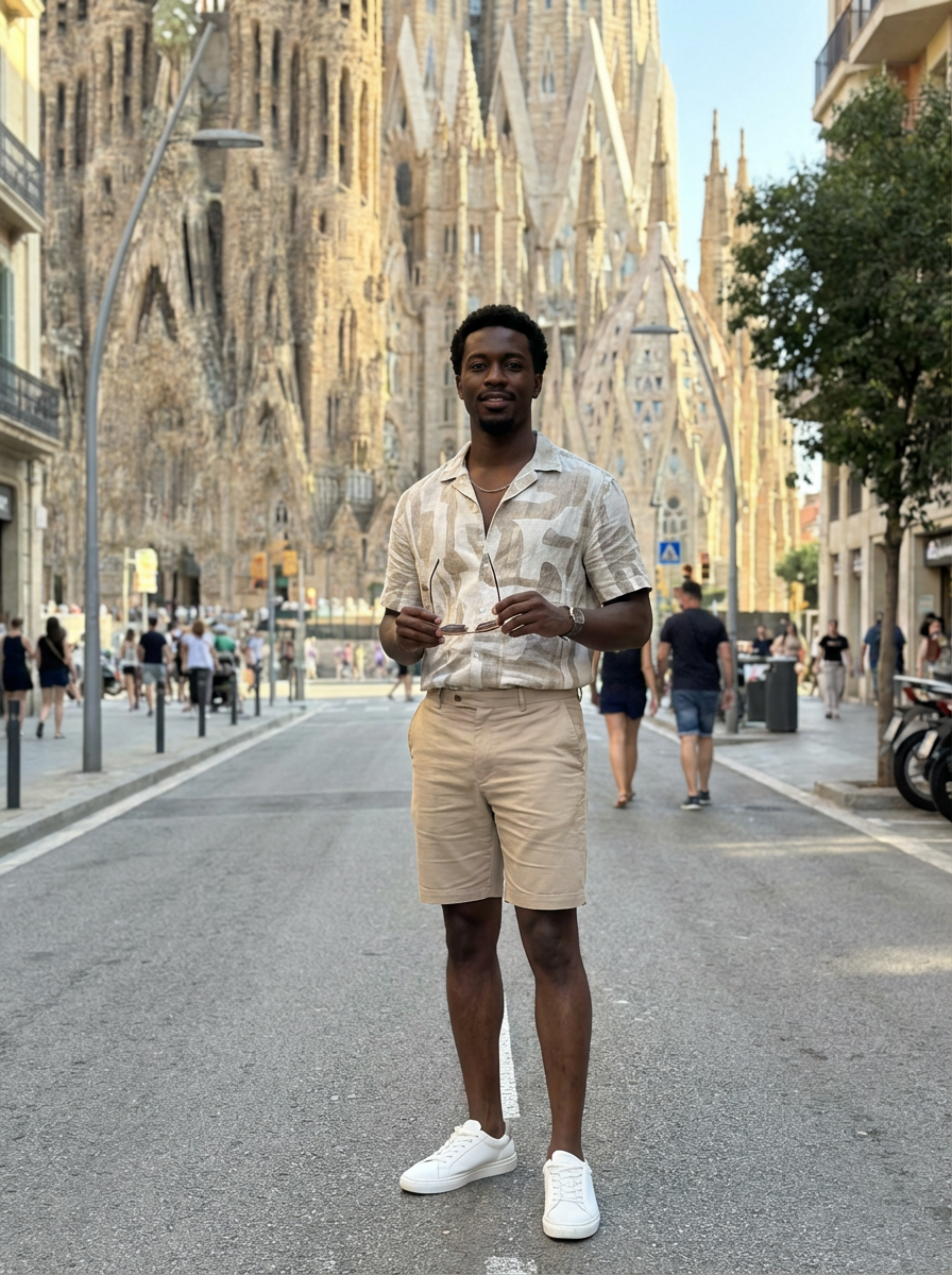 sharp and trendy model in Barcelona wearing a stylish summer outfit, La Sagrada Família in the background