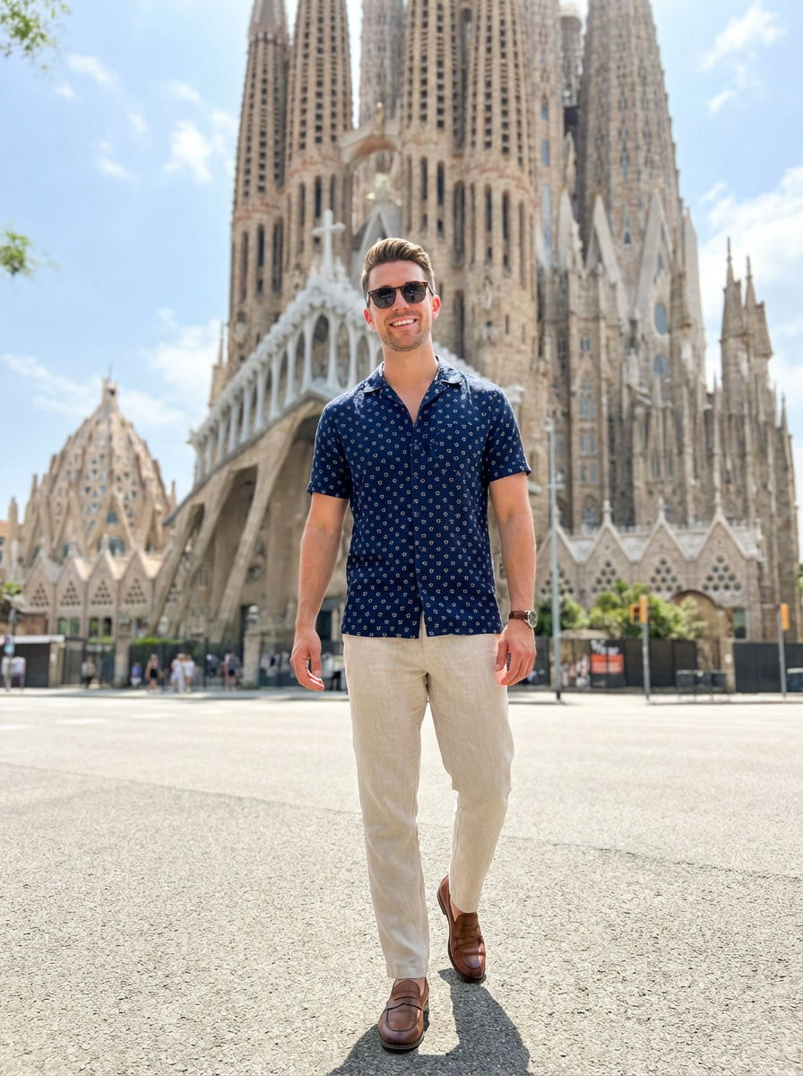 sharp and trendy model in Barcelona wearing a stylish summer outfit, La Sagrada Família in the background