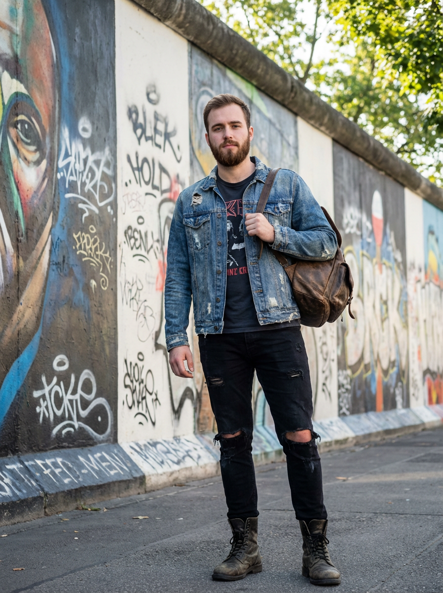 sharp and trendy model in Berlin wearing a grunge-inspired outfit, Berlin Wall in the background