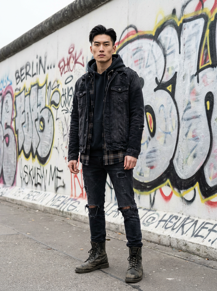 sharp and trendy model in Berlin wearing a grunge-inspired outfit, Berlin Wall in the background