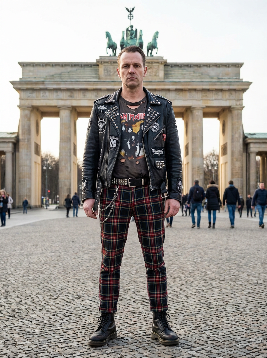 sharp and trendy model in Berlin wearing a punk-inspired outfit, Brandenburg Gate in the background