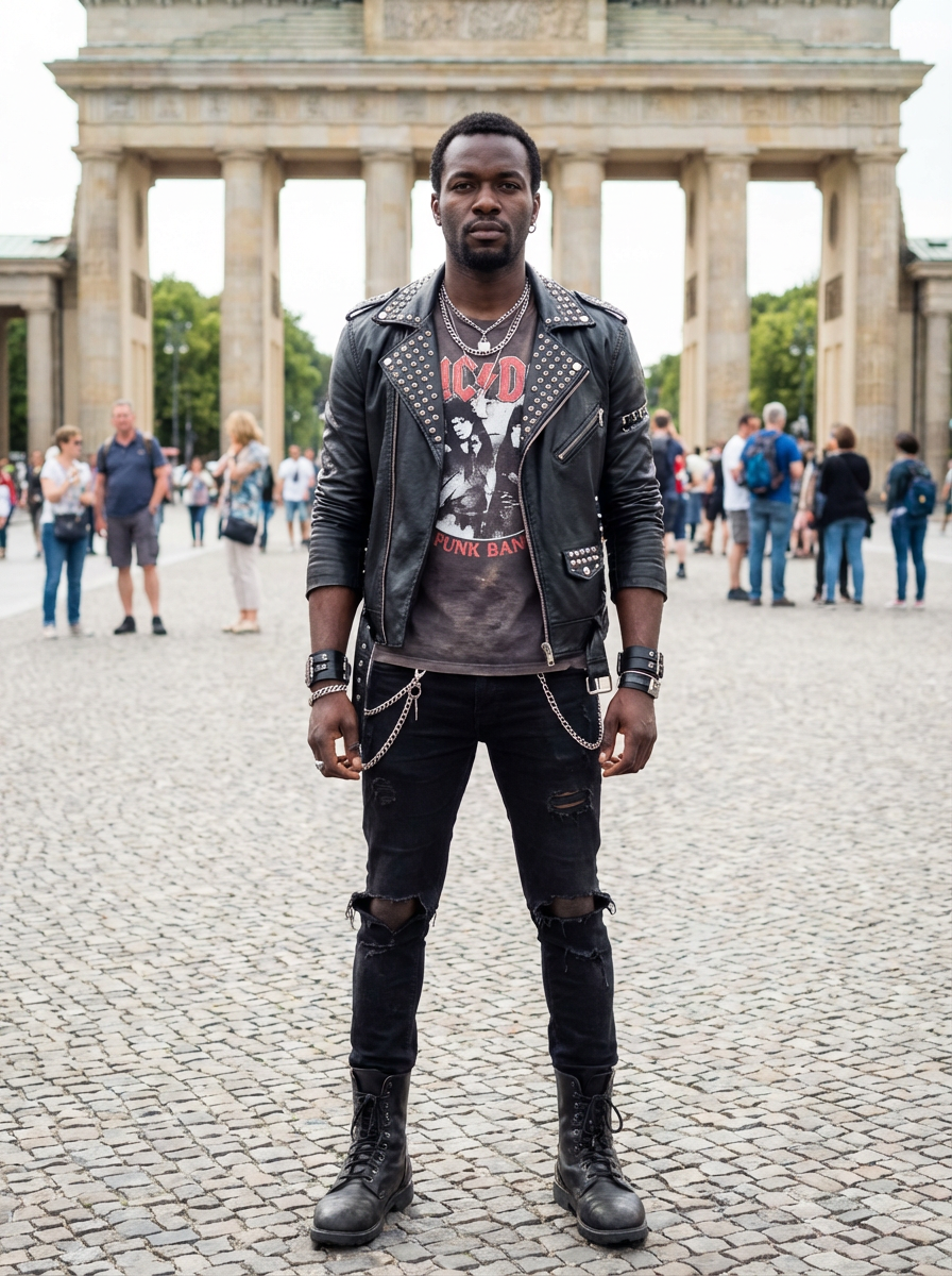 sharp and trendy model in Berlin wearing a punk-inspired outfit, Brandenburg Gate in the background