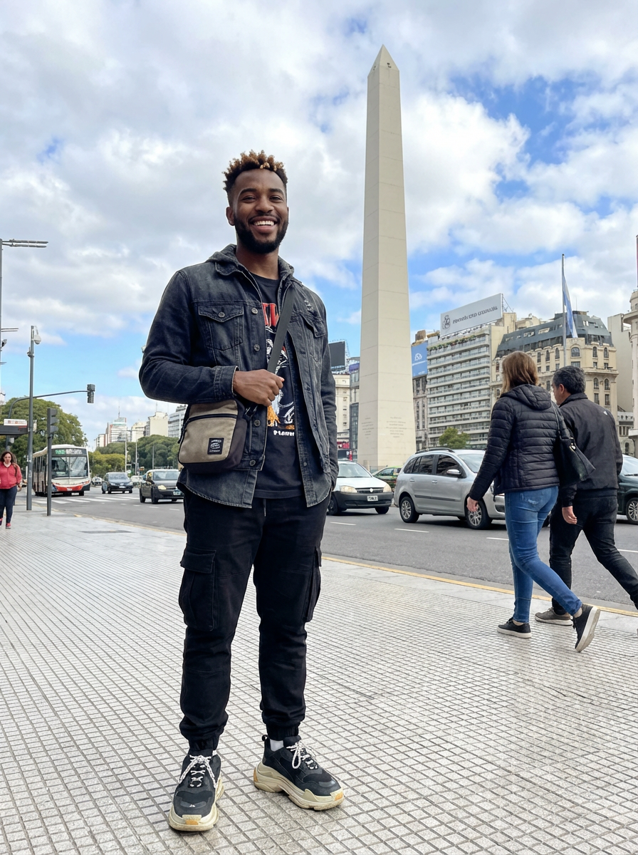 sharp and trendy model in Buenos Aires wearing a modern street style outfit, Obelisco de Buenos Aires in the background
