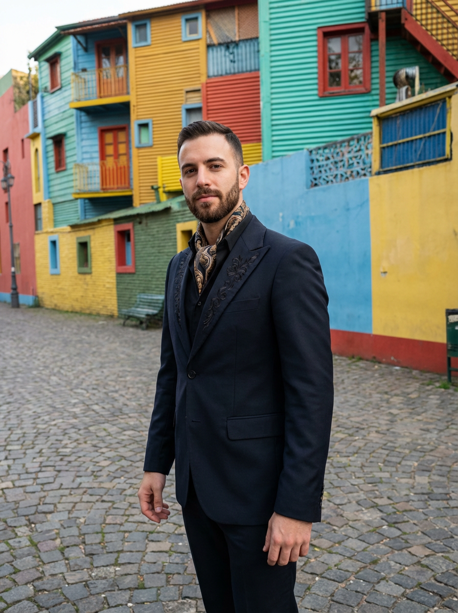 sharp and trendy model in Buenos Aires wearing a tango-inspired dress/suit, colorful houses of La Boca neighborhood in the background