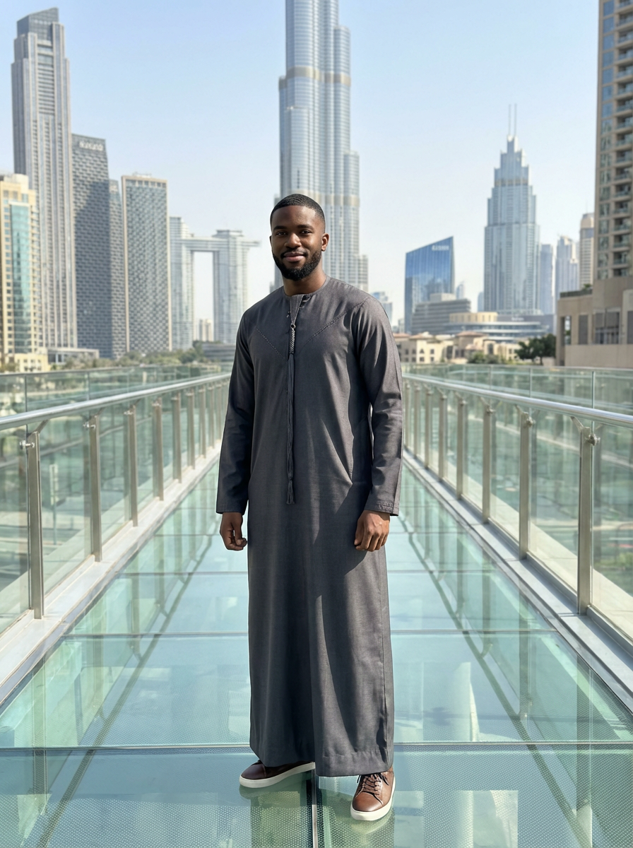 sharp and trendy model in Dubai wearing a modern, chic abaya/thobe, skyscrapers of Dubai in the background