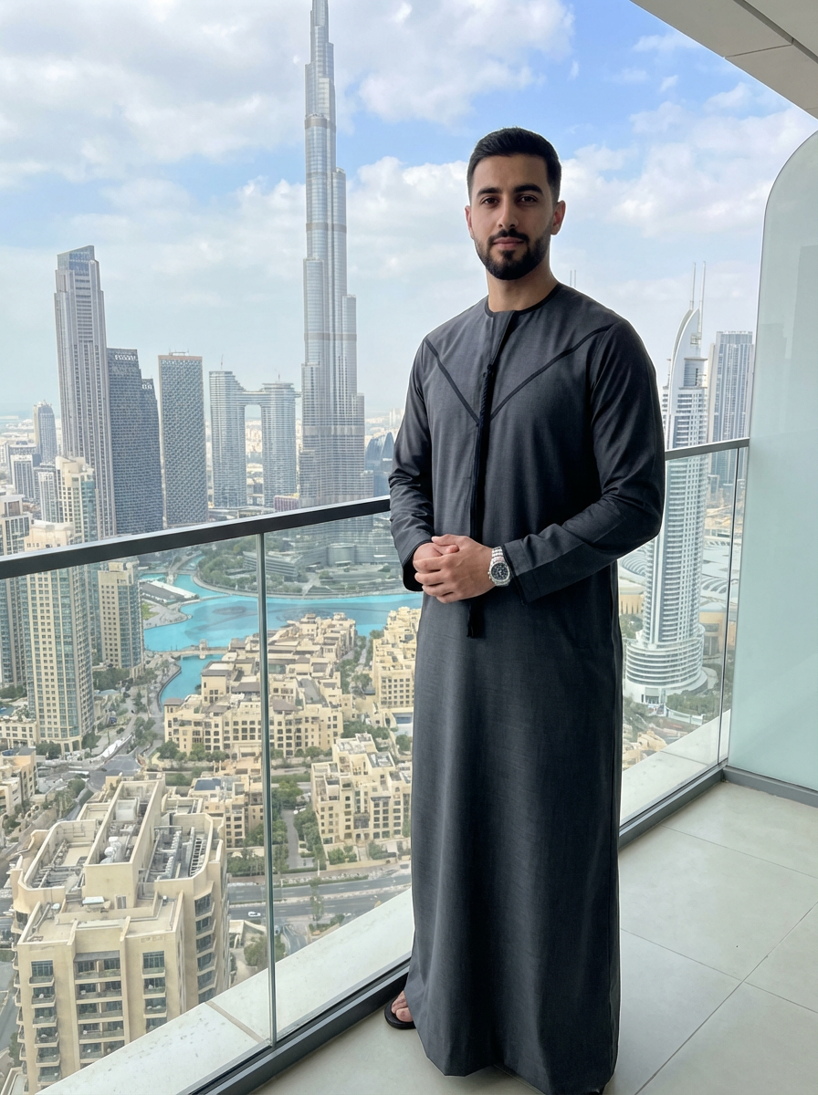 sharp and trendy model in Dubai wearing a modern, chic abaya/thobe, skyscrapers of Dubai in the background