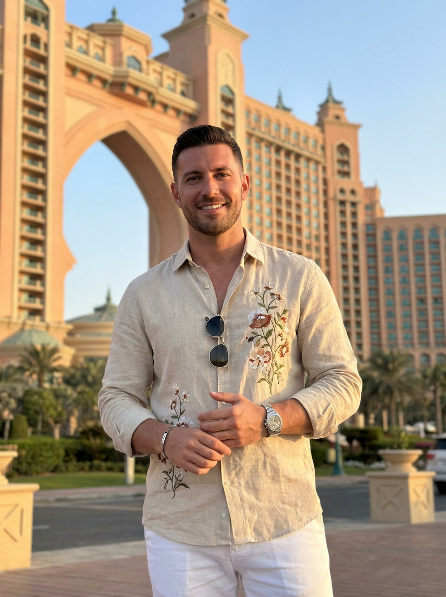 sharp and trendy model in Dubai wearing a stylish sundress/linen shirt, the Atlantis hotel in the background
