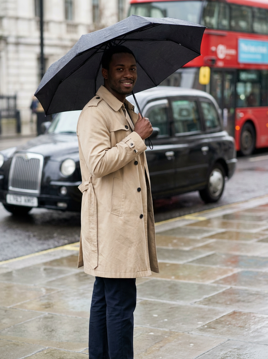 sharp and trendy model in London sporting a trench coat and holding an umbrella, iconic London cab in the background