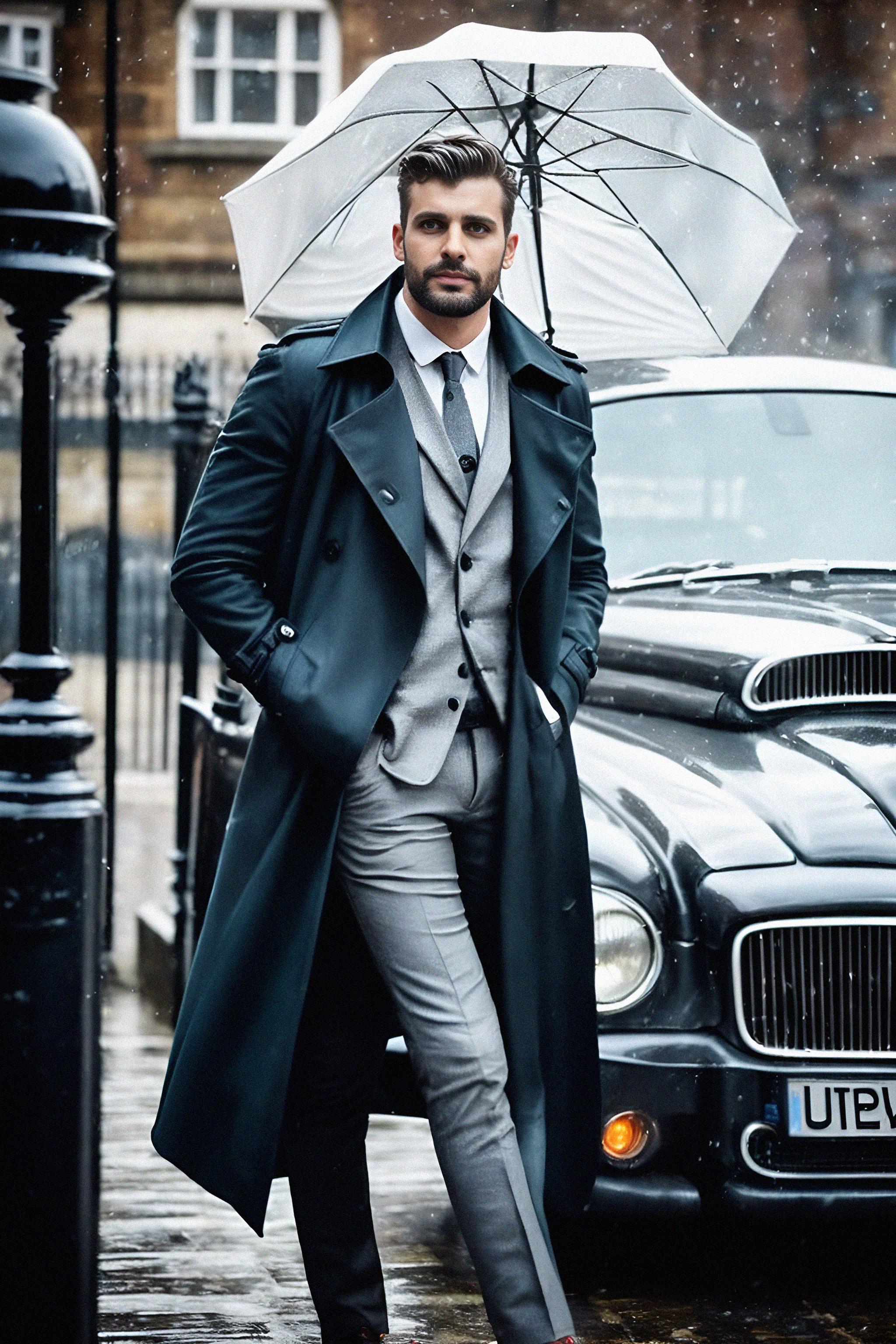 sharp and trendy model in London sporting a trench coat and holding an umbrella, iconic London cab in the background
