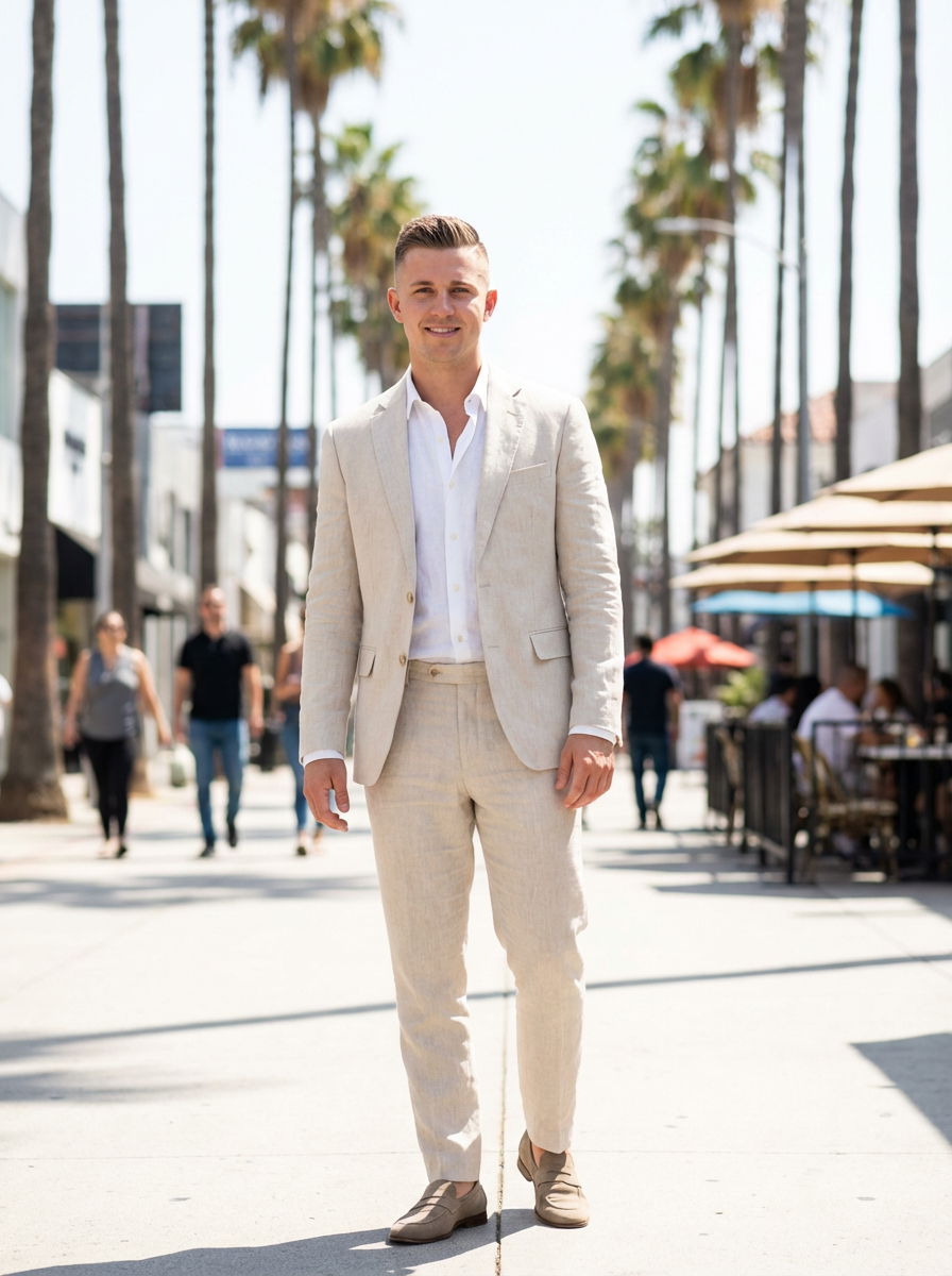 sharp and trendy model in Los Angeles wearing a summer dress/linen suit, palm trees in the background
