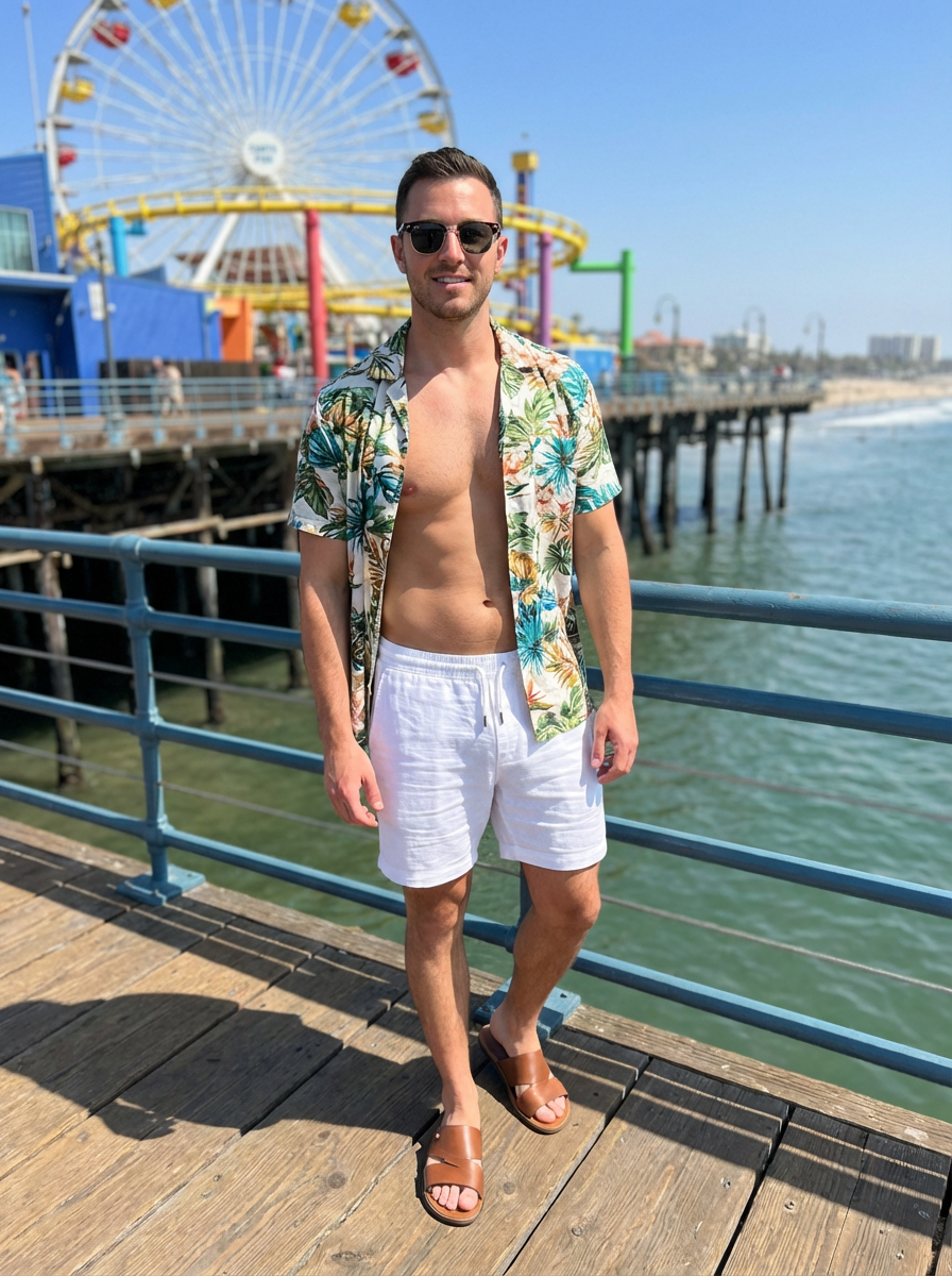 sharp and trendy model in Los Angeles wearing a trendy beach outfit, Santa Monica pier in the background