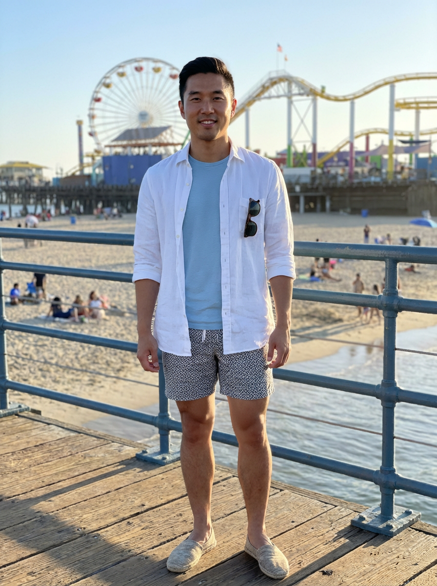 sharp and trendy model in Los Angeles wearing a trendy beach outfit, Santa Monica pier in the background