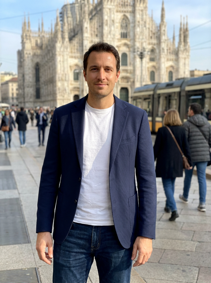 sharp and trendy model in Milan wearing a fashionable blazer and jeans, Duomo di Milano in the background