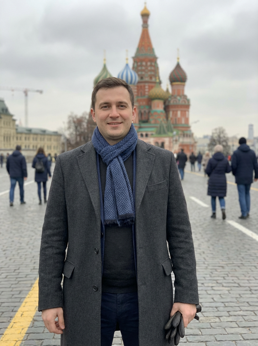 sharp and trendy model in Moscow wearing a stylish coat and scarf, Saint Basil's Cathedral in the background