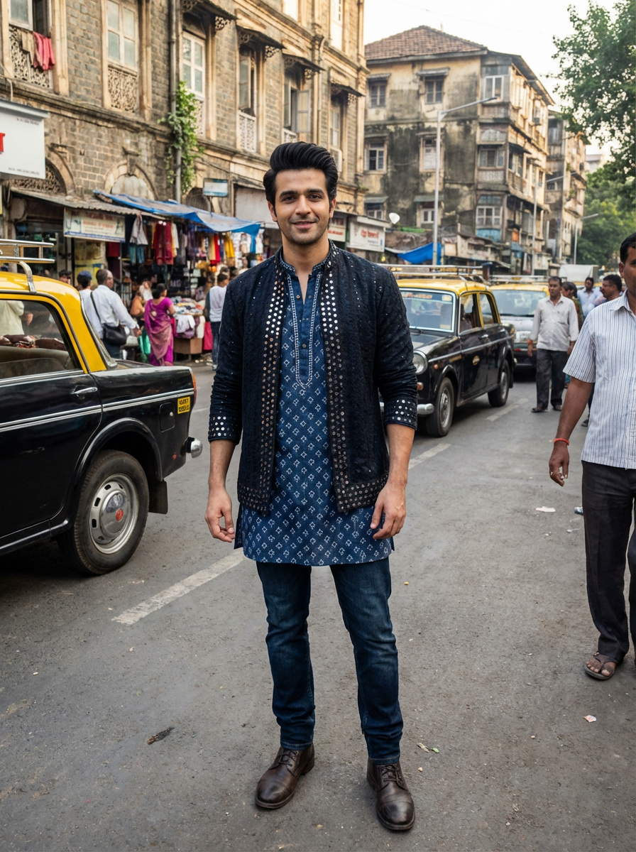 sharp and trendy model in Mumbai wearing a contemporary fusion outfit, bustling streets of Mumbai in the background