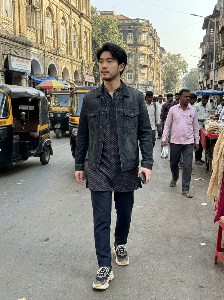 sharp and trendy model in Mumbai wearing a contemporary fusion outfit, bustling streets of Mumbai in the background