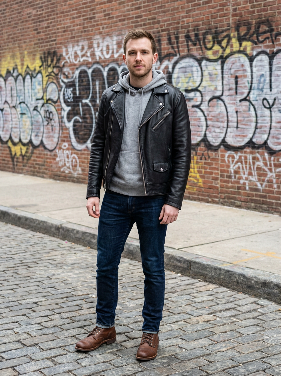 sharp and trendy model in New York City wearing a leather jacket, jeans, and boots with urban graffiti in the background
