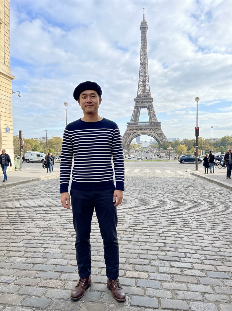 sharp and trendy model in Paris, wearing a beret and striped top, Eiffel Tower in the background