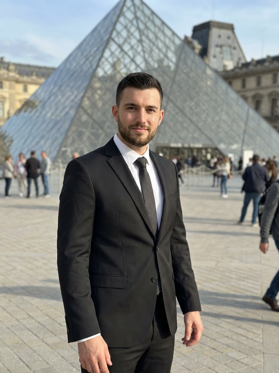 sharp and trendy model in Paris wearing a chic black dress/suit, Louvre pyramid in the background