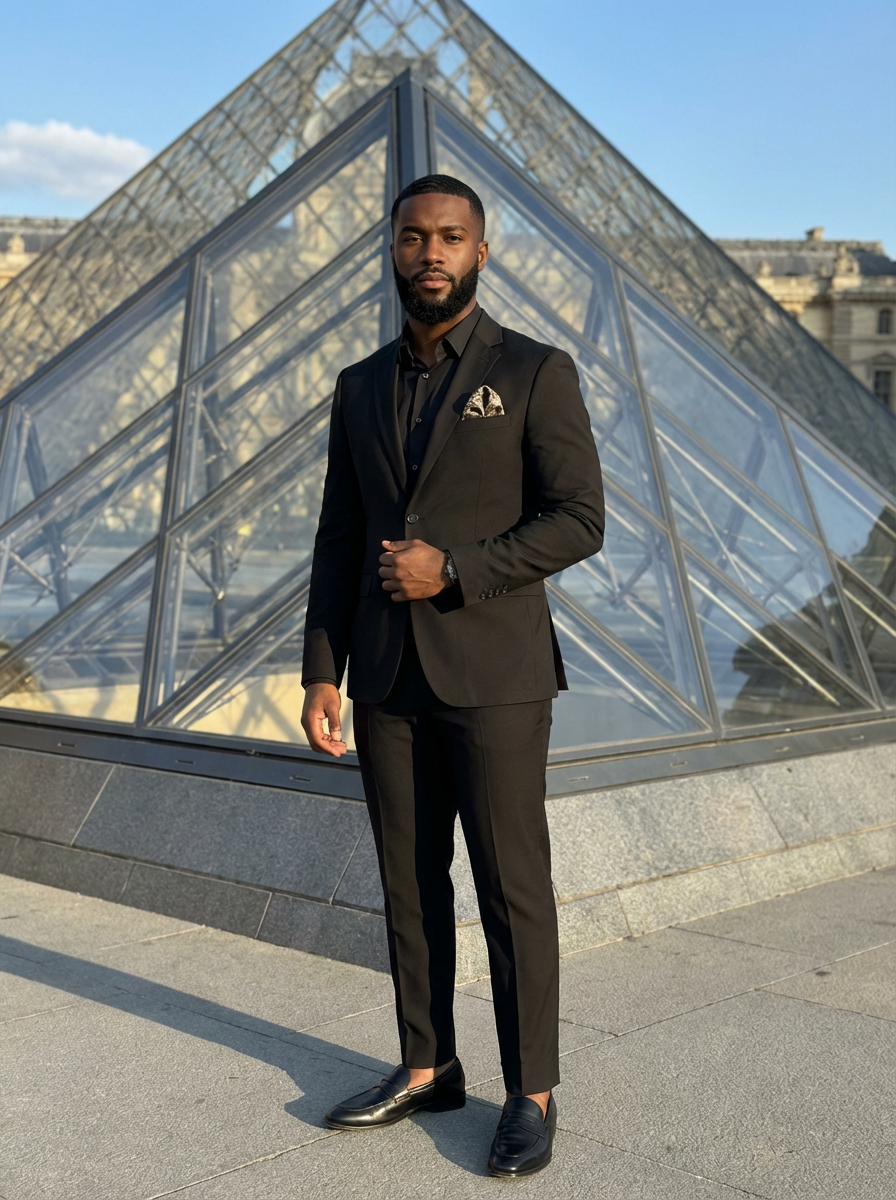 sharp and trendy model in Paris wearing a chic black dress/suit, Louvre pyramid in the background