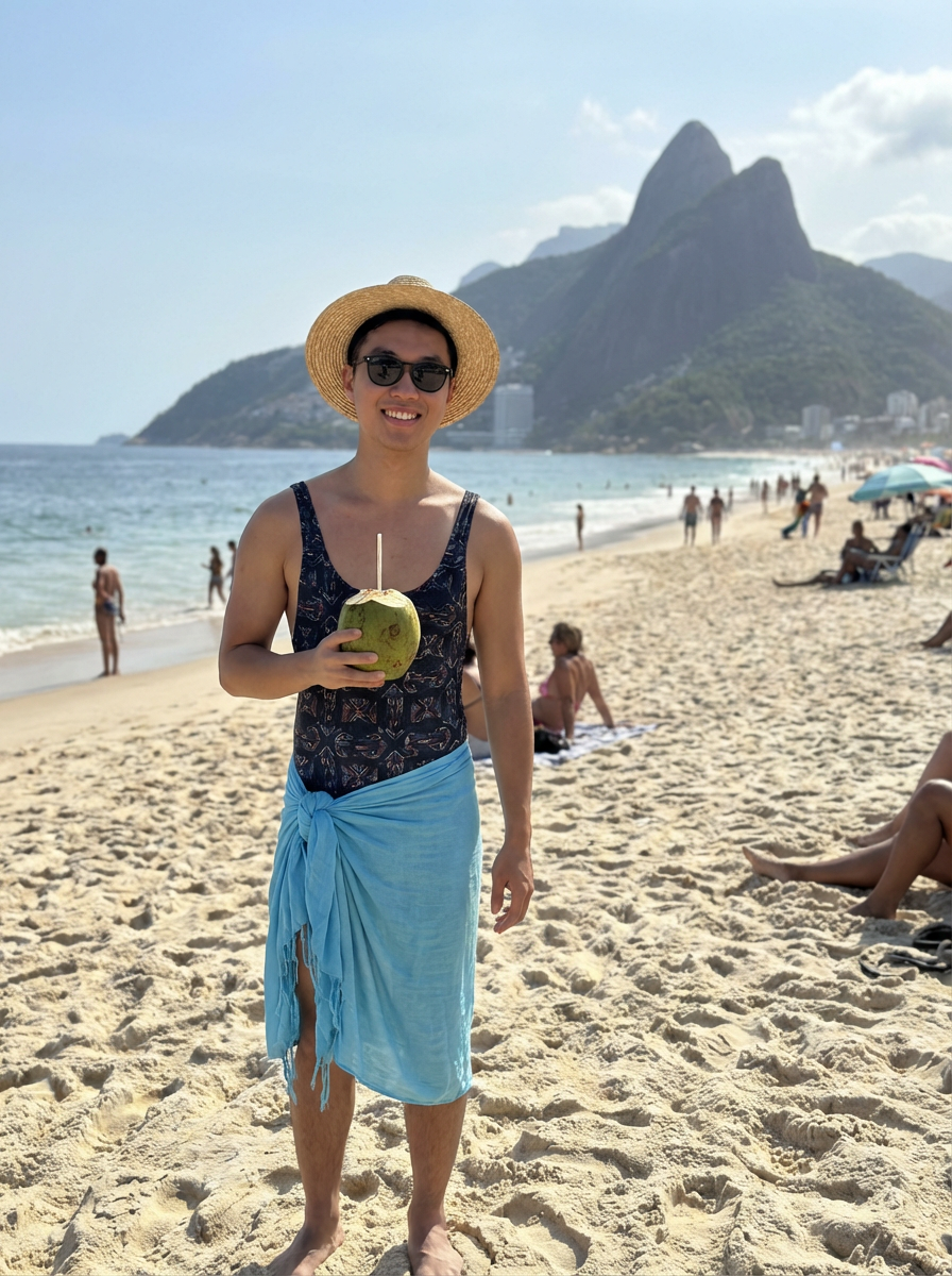 sharp and trendy model in Rio de Janeiro wearing a trendy swimsuit and sarong, Copacabana Beach in the background