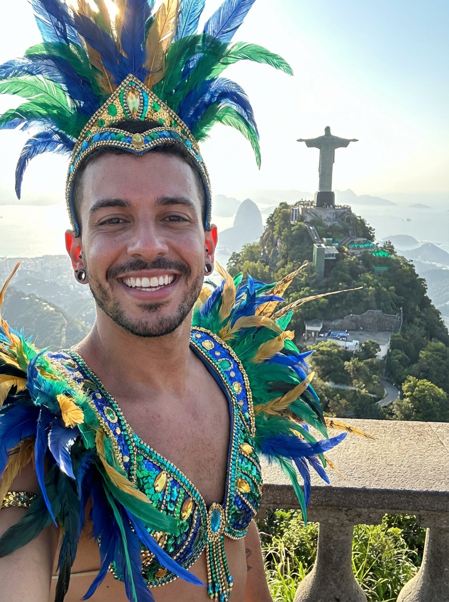 sharp and trendy model in Rio de Janeiro wearing a vibrant carnival-inspired costume, Christ the Redeemer statue in the background