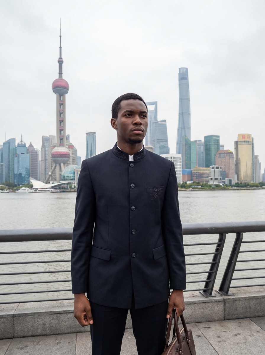 sharp and trendy model in Shanghai wearing a traditional qipao/mandarin-collar suit, modern skyline in the background