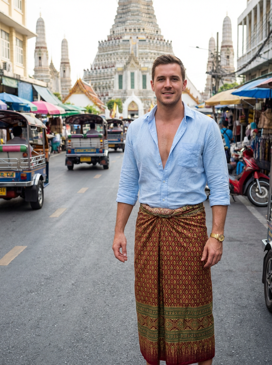 sharp and trendy model in Thailand wearing a vibrant sarong, Bangkok in the background