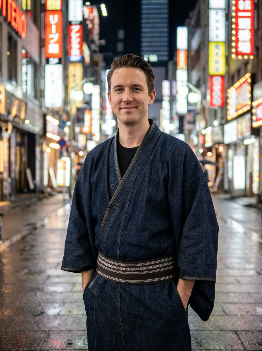 sharp and trendy model in Tokyo wearing a modern take on a traditional kimono, neon lights of the city in the background
