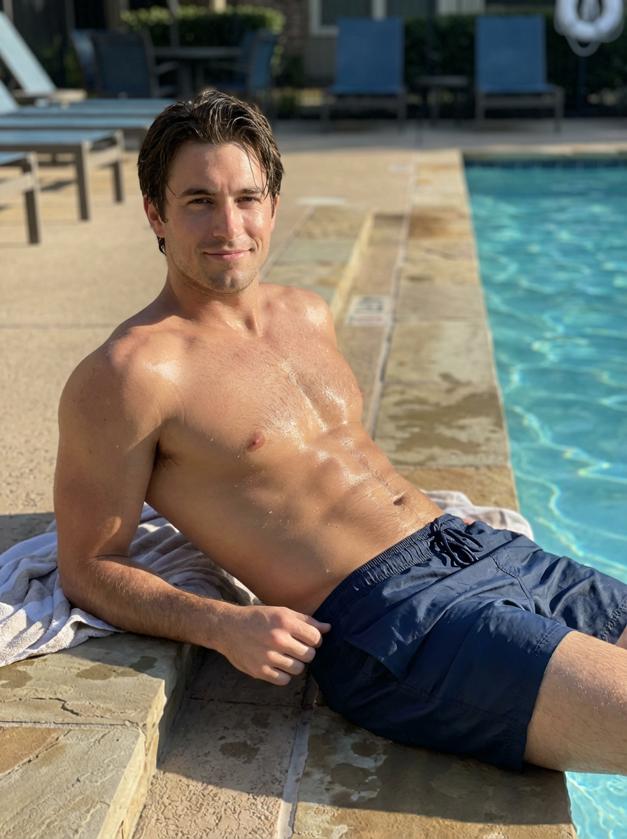 shirtless model at pool, wet skin glistening, muscular physique, lounging confidently, summer vibes