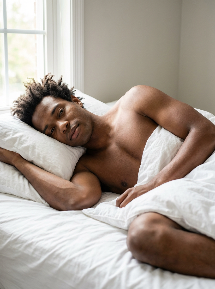 shirtless model in bed, morning light through window, tousled hair, intimate relaxed pose, white sheets