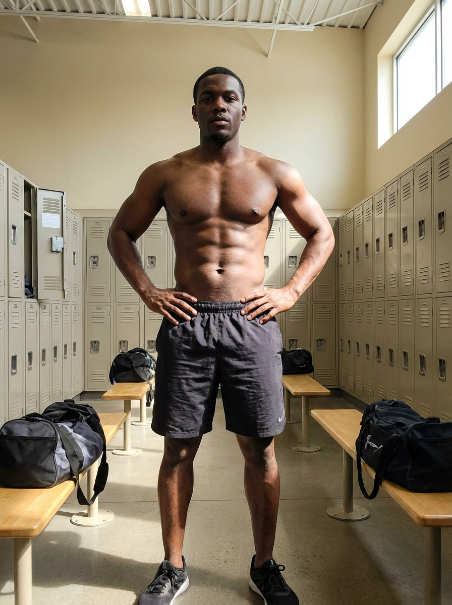 shirtless muscular model, defined abs and chest, confident masculine pose, natural lighting, gym locker room setting