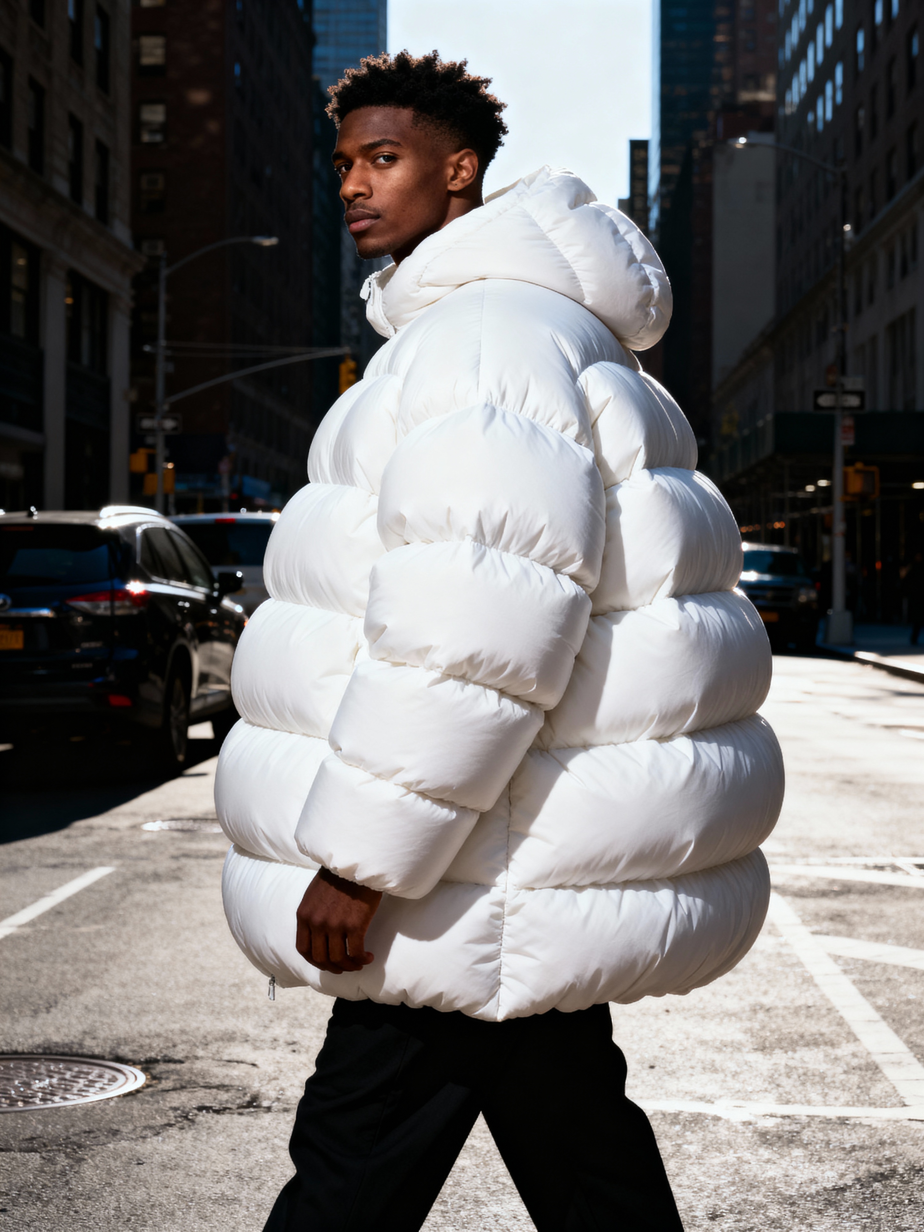 Related photosside view of woman in a super big round white puffer closed coat with an exaggerated, voluminous design with oversized hood and thick, many quilted sections that contribute to its inflated appearance. the coat is closed and inflated. woman is walking outside in New York City street.woman in a super big round white puffer closed coat with an exaggerated, voluminous design with oversized hood and thick, many quilted sections that contribute to its inflated appearance. the coat is closed and inflated. woman is walking outside in New York City street.side view of man in a super big round white puffer closed coat with an exaggerated, voluminous design with oversized hood and thick, many quilted sections that contribute to its inflated appearance. the coat is closed and inflated. man is walking outside in New York City street.a man in a festival-inspired outfit, dancing with  a crowd of fellow festival-goers, capturing the energetic and lively atmospheresharp and trendy man in Milan wearing a fashionable blazer and jeans, Duomo di Milano in the backgroundwoman blowing bubbles. all around her are floating bubbles. many bubbles floating. the bubbles reflect her face. it is golden hour at sunset.