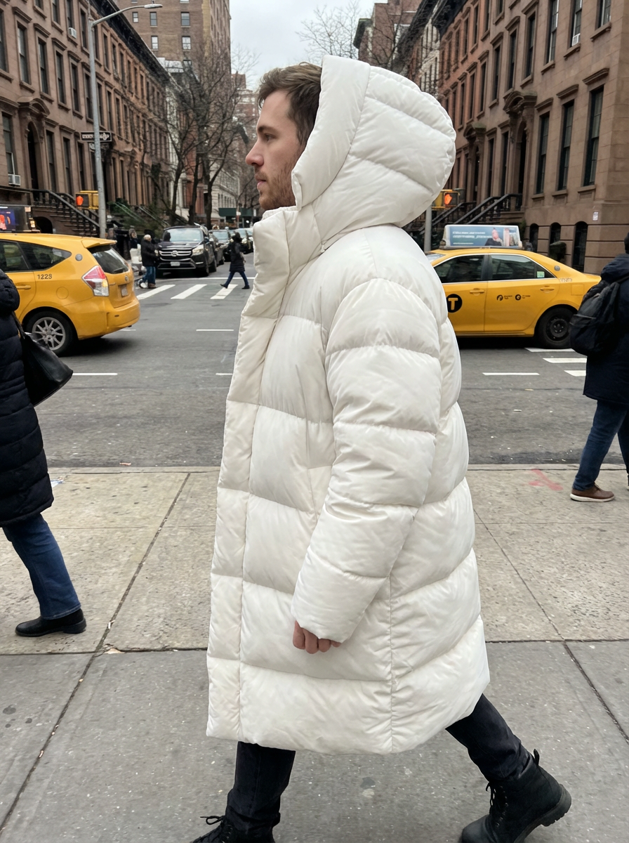 side view of model in a super big round white puffer closed coat with an exaggerated, voluminous design with oversized hood and thick, many quilted sections that contribute to its inflated appearance. the coat is closed and inflated. model is walking outside in New York City street.
