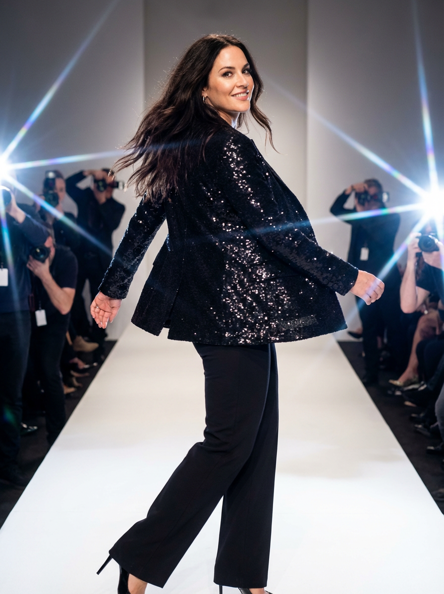 side view of model striding confidently down a fashion runway, captured mid-twirl, surrounded by flashing camera lights.