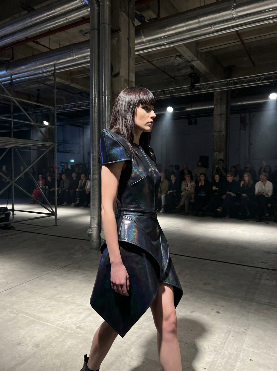 side view of model walking on a fashion runway in an industrial space, showcasing a futuristic outfit with sharp lines