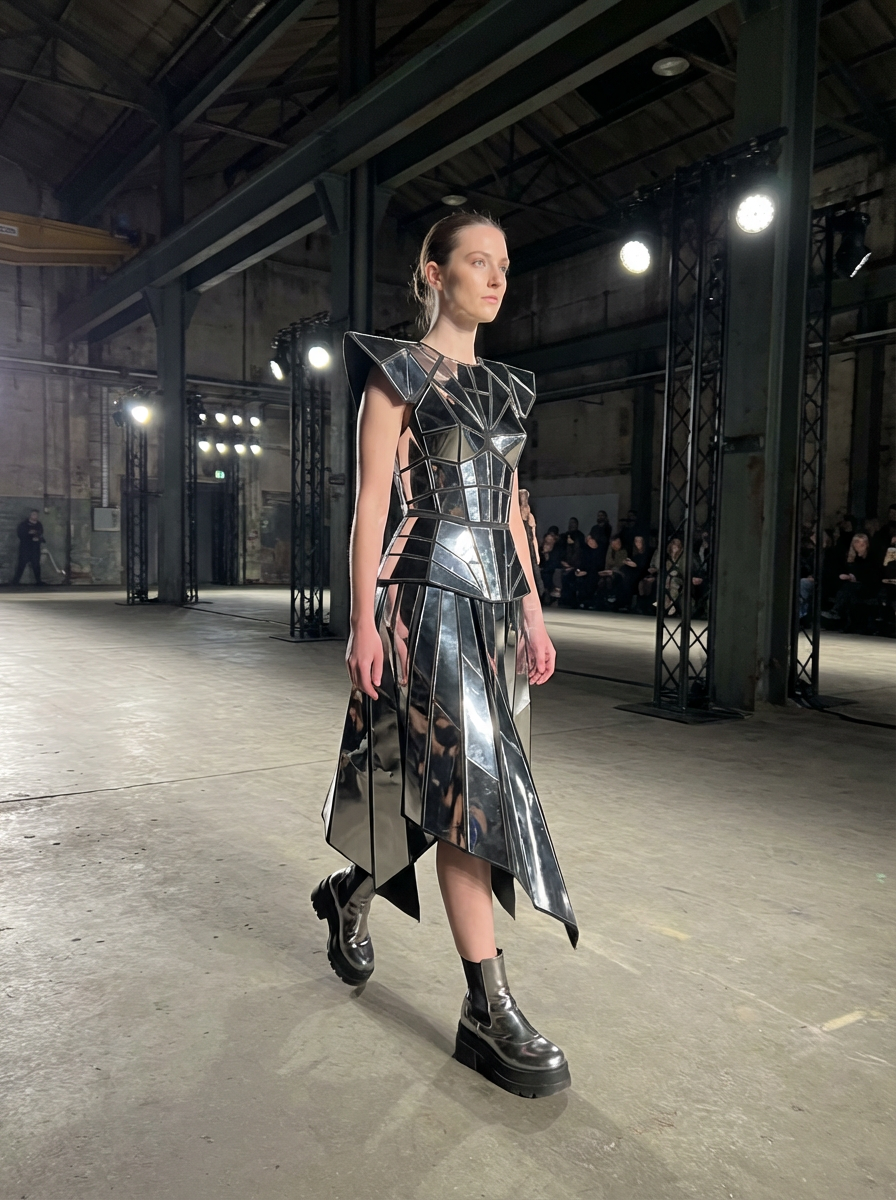 side view of model walking on a fashion runway in an industrial space, showcasing a futuristic outfit with sharp lines
