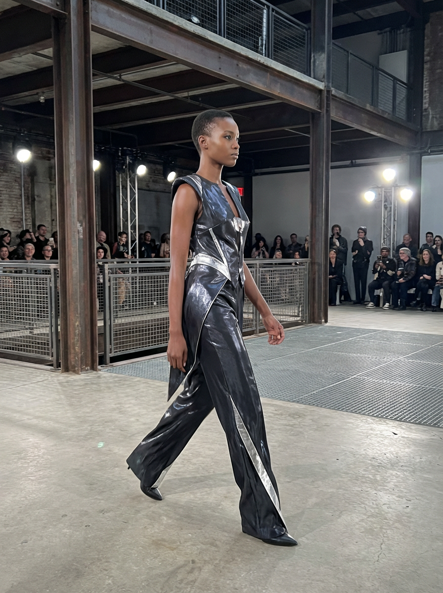 side view of model walking on a fashion runway in an industrial space, showcasing a futuristic outfit with sharp lines