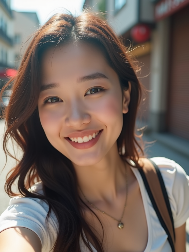 sincere feminine model snapping a selfie on a casual day out, with a genuine smile