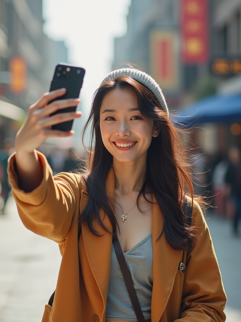 sincere feminine model snapping a selfie on a casual day out, with a genuine smile