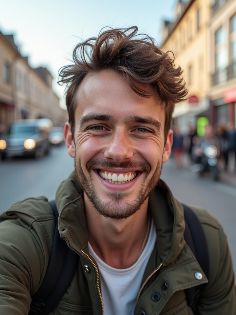 sincere masculine model snapping a selfie on a casual day out, with a genuine smile