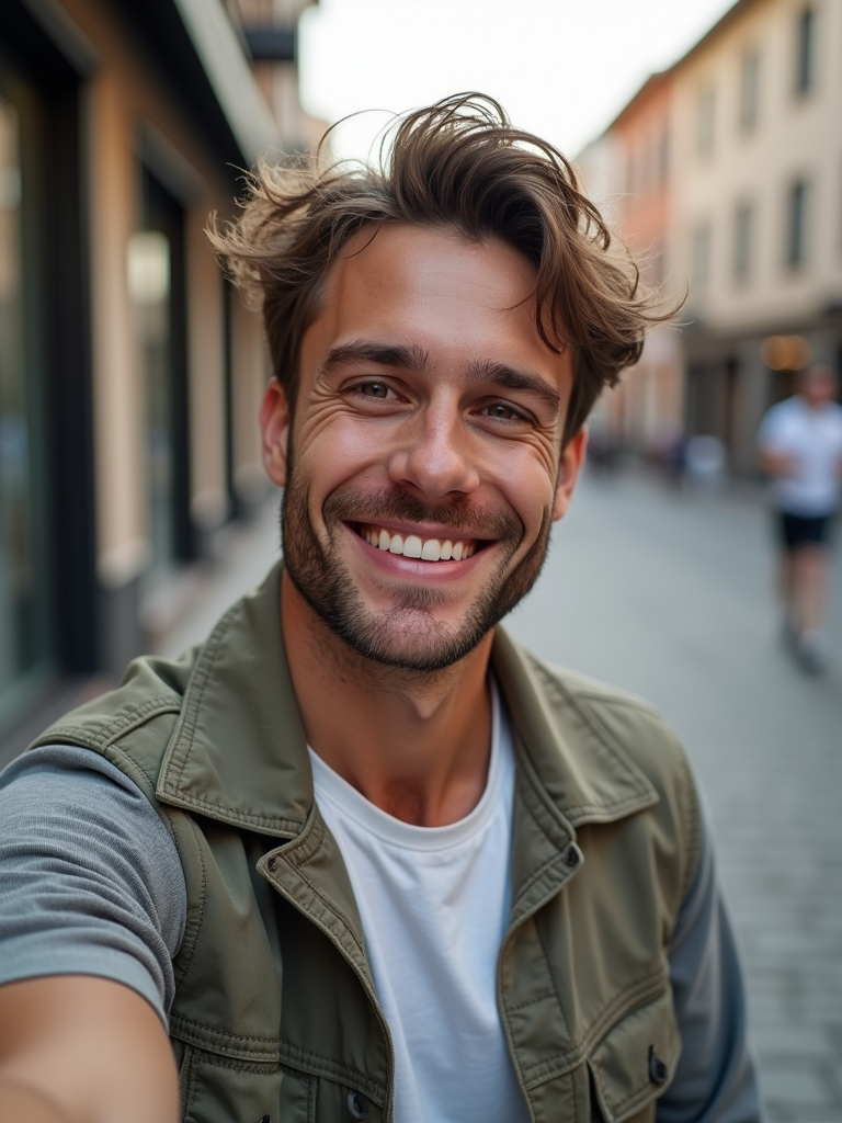 sincere masculine model snapping a selfie on a casual day out, with a genuine smile